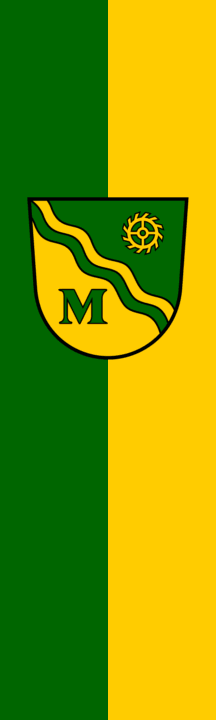 | Description of arms (German): | Von Grün und Gold durch einen schrägrechten Wellenbalken in verwechselten Farben gespalten, oben begleitet von einem goldenen Mühlrad, unten von einem grünen M. [1] |