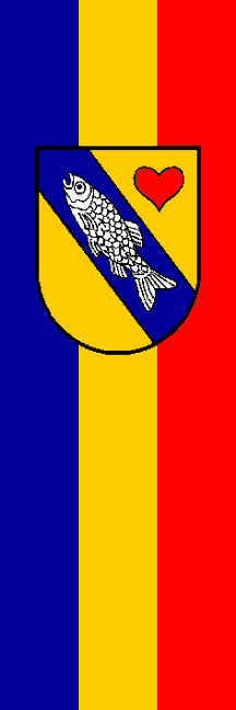 | Description of arms (German): | In Gold ein blauer Schrägbalken, darin ein silberner Fisch, oben begleitet von einem roten Herz. |