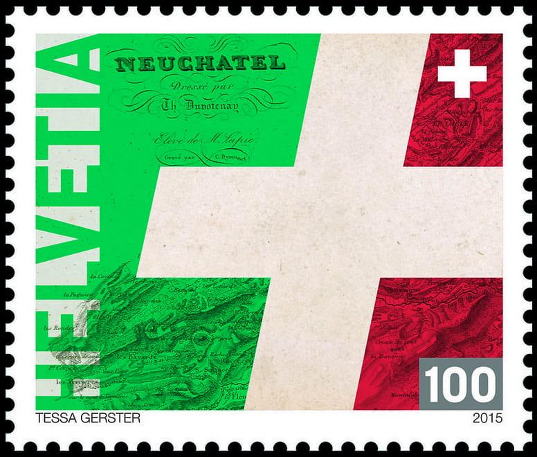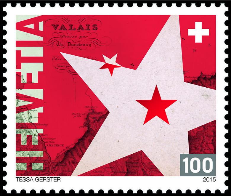 Emblems shown: Flag of Switzerland, coats of arms of Valais, Neuchâtel, Genève