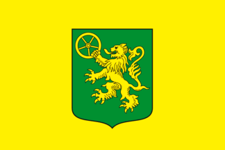 The municipal arms, granted by Royal Decree on 30 June 1838, are "Vert a lion proper holding in dexter a five-ray wheel all or".