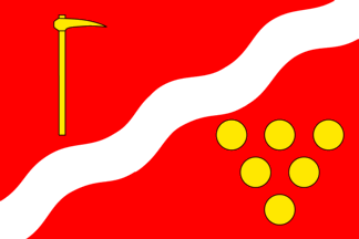 The flag of Flémalle is red, divided by a white ascending wavy diagonal, with a yellow pickaxe in canton and six yellow discs placed 3+2+1 in lower fly.