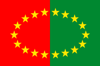 germanophones [w2v03], the Heraldry and Vexillology Council of the French Community proposed a flag vertically divided green-red with, in the center, the silhouette of a yellow keep surrounded with 18 stars arranged in an hexagon. The municipality swapped the vertical stripes, dropped the keep and changed the hexagon into an ellipse.