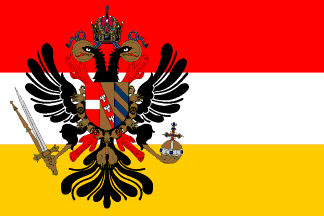 The flag used as the civil ensign of the Austrian Netherlands from 24 September 1781 to 31 December 1786 is in proportion 2:3, horizontally divided red-white-yellow. Behind the Imperial Austrian eagle is the Cross of Burgundy. On the shield, the fields represent, from left to right, Austria, Lorraine and Burgundy.