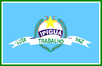 The flag of Ipiguá is light blue with a thin green and white border and an emblem in the middle (not the municipal coat of arms). The emblem is made of a white disk charged with a blue stripe inscribed with the municipality's name in white letters. A yellow star is placed at the top of the disk, which is surrounded by two stylized branches of coffee. Beneath the disk is a white scroll inscribed with the motto "LUTA TRABALHO PAZ" in green letters.