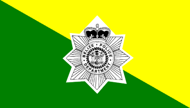 The flag of the Belize Police Department is diagonally divided, lower left part is green, and upper right part is yellow. The badge of Police is placed in the middle of the flag.