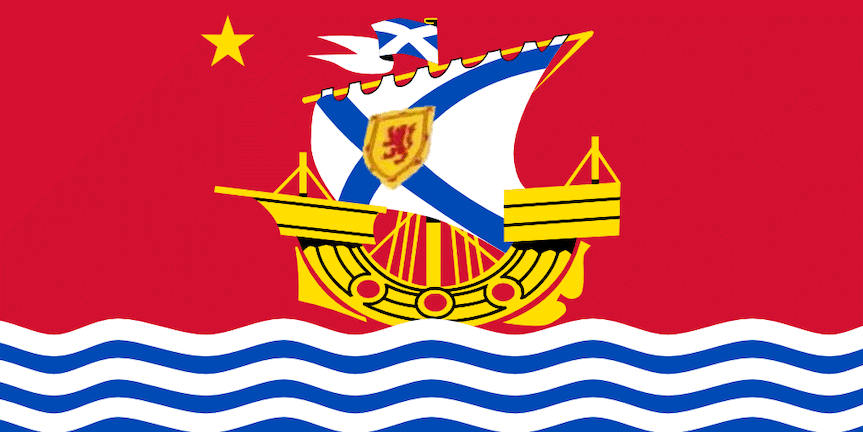 A red flag with five white and blue wavy stripes across the bottom, on which sails a ship with a Nova Scotia flag as its sail.