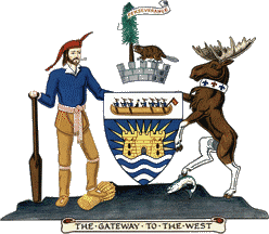 Azure a castle irradiated, its portcullis raised Or, issuant from three bars wavy, on a chief Argent a birchbark canoe therein a European man and seven Canadian voyageurs the latter with their paddles in action proper, in the stern a flag Gules inscribed NW in letters Or