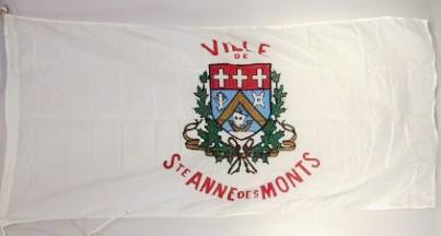 The previous flag, used probably in the 80s or 90s and maybe until the 2000s, was white with the coat of arms centered upon it. Above it, VILLE DE is found in red; underneath is STE ANNE DES MONTS in red, with the words in between being smaller; all words on the flag are curved.