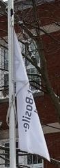 This is the flag of Saint-Basile-Le-Grand (Montérégie) as I saw it flying over the town hall in December of 2005. It is white with the coat of arms and the name of the municipality underneath in "dirty" yellow (which I assume to be gold). The coat of arms might have a slightly different design, especially for the horse's head.