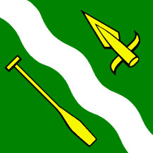 Vert a Bend wavy Argent between a Spearhead and an Oar both Or.