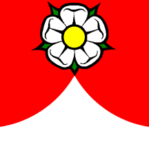 Per chevron embowed Gules and Argent and in chief a Rose of the last