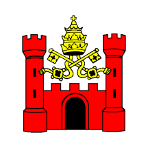 Argent, a Castle Gules ensigned by a Tiara over two Keys in Saltire Or.