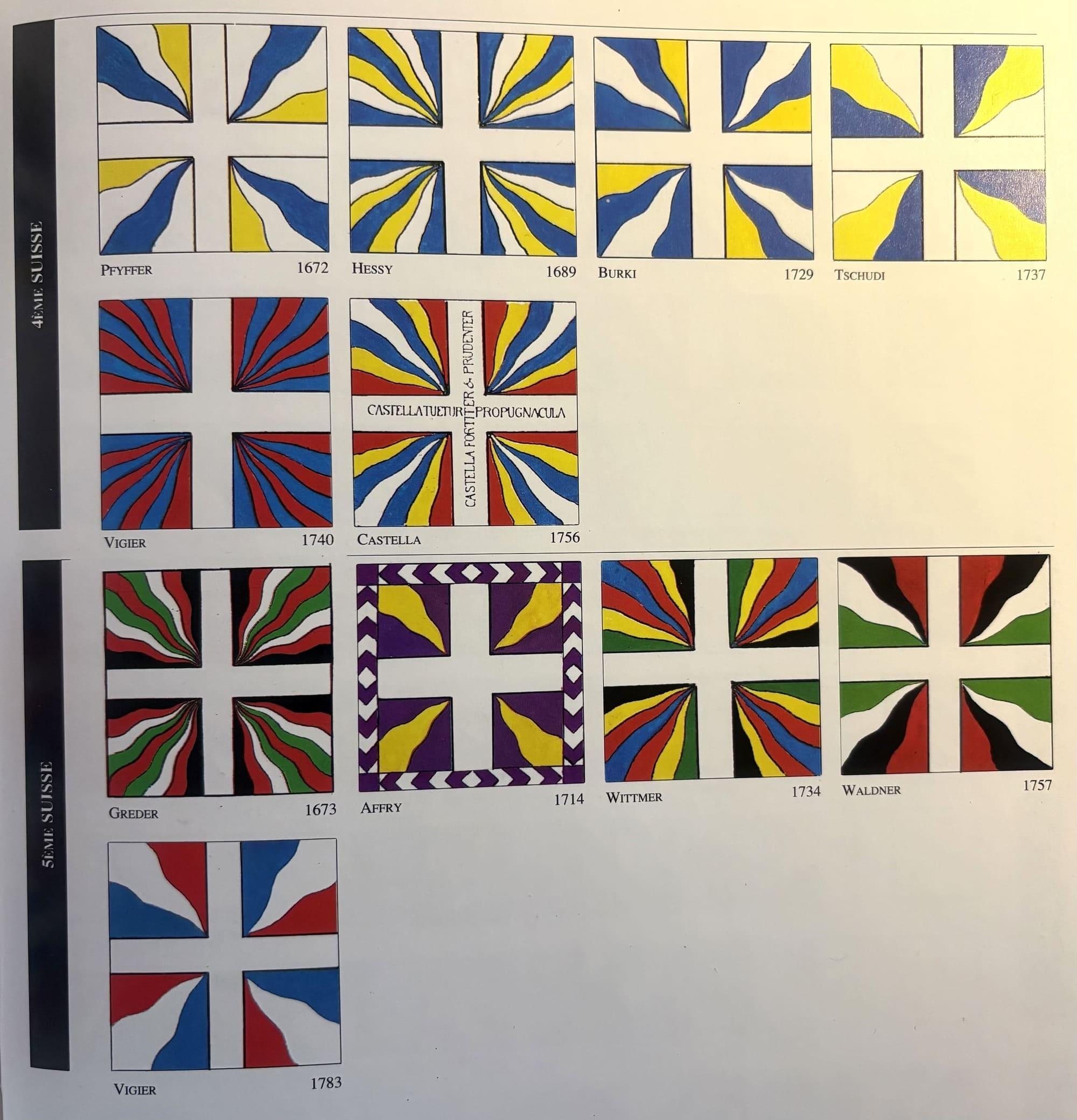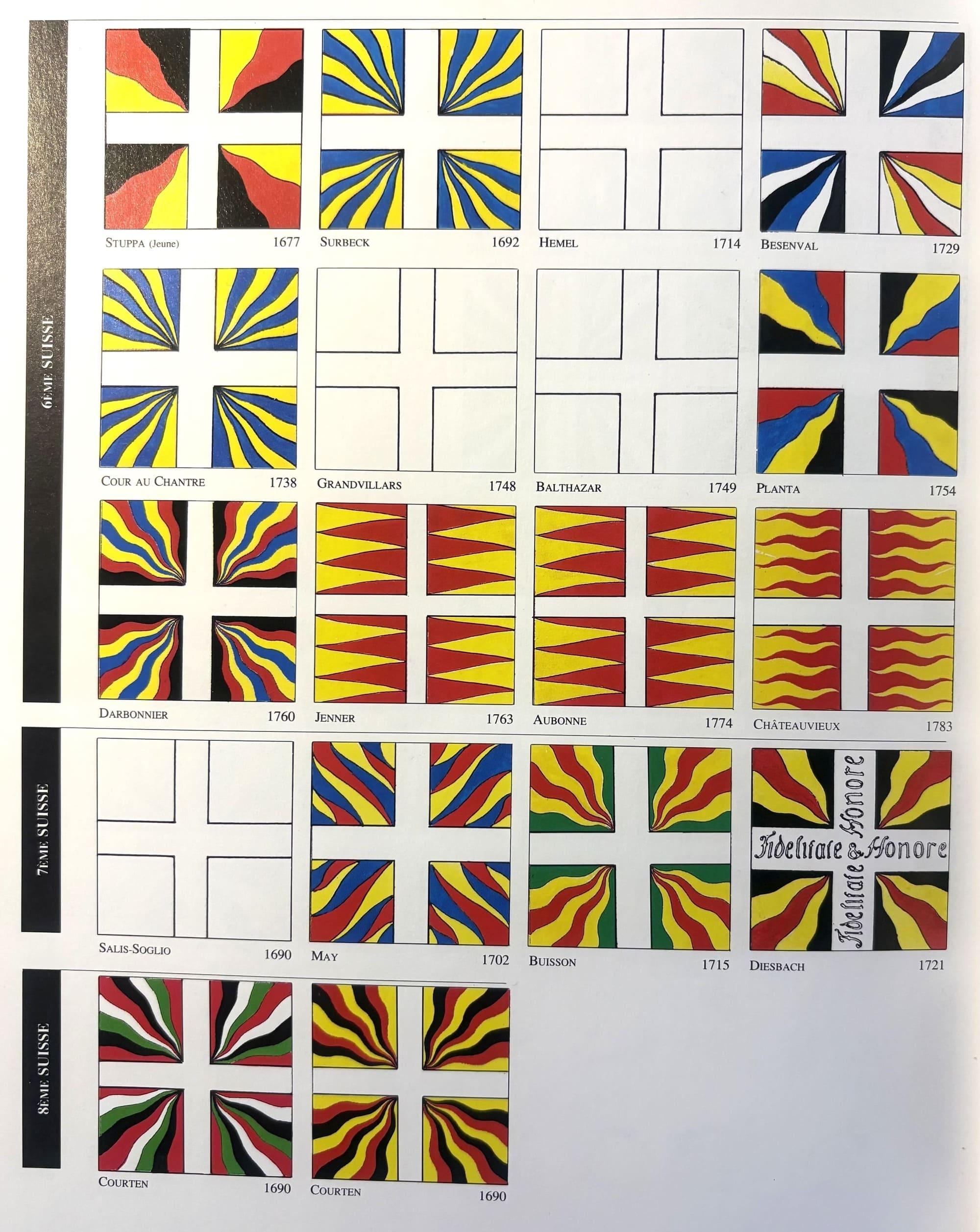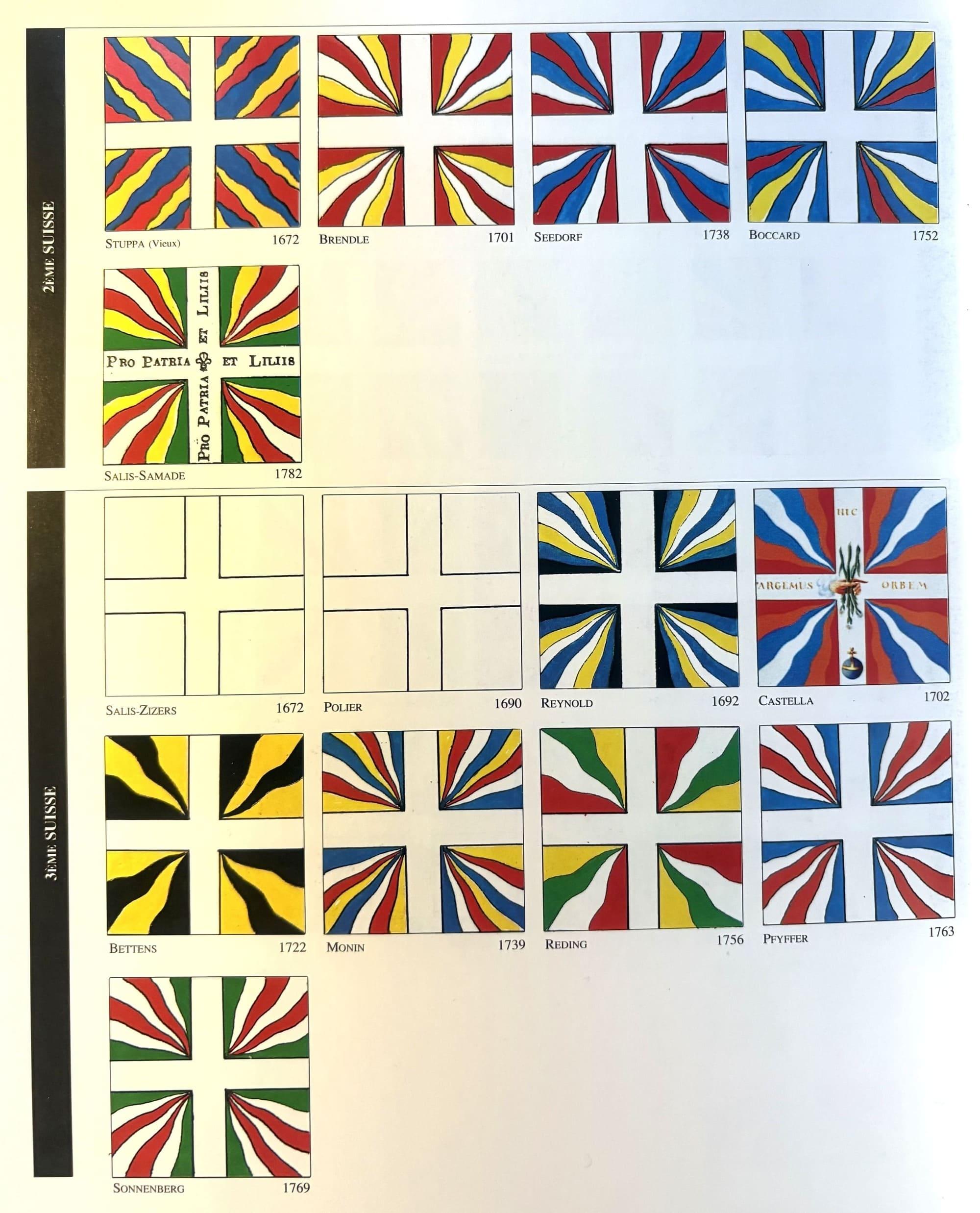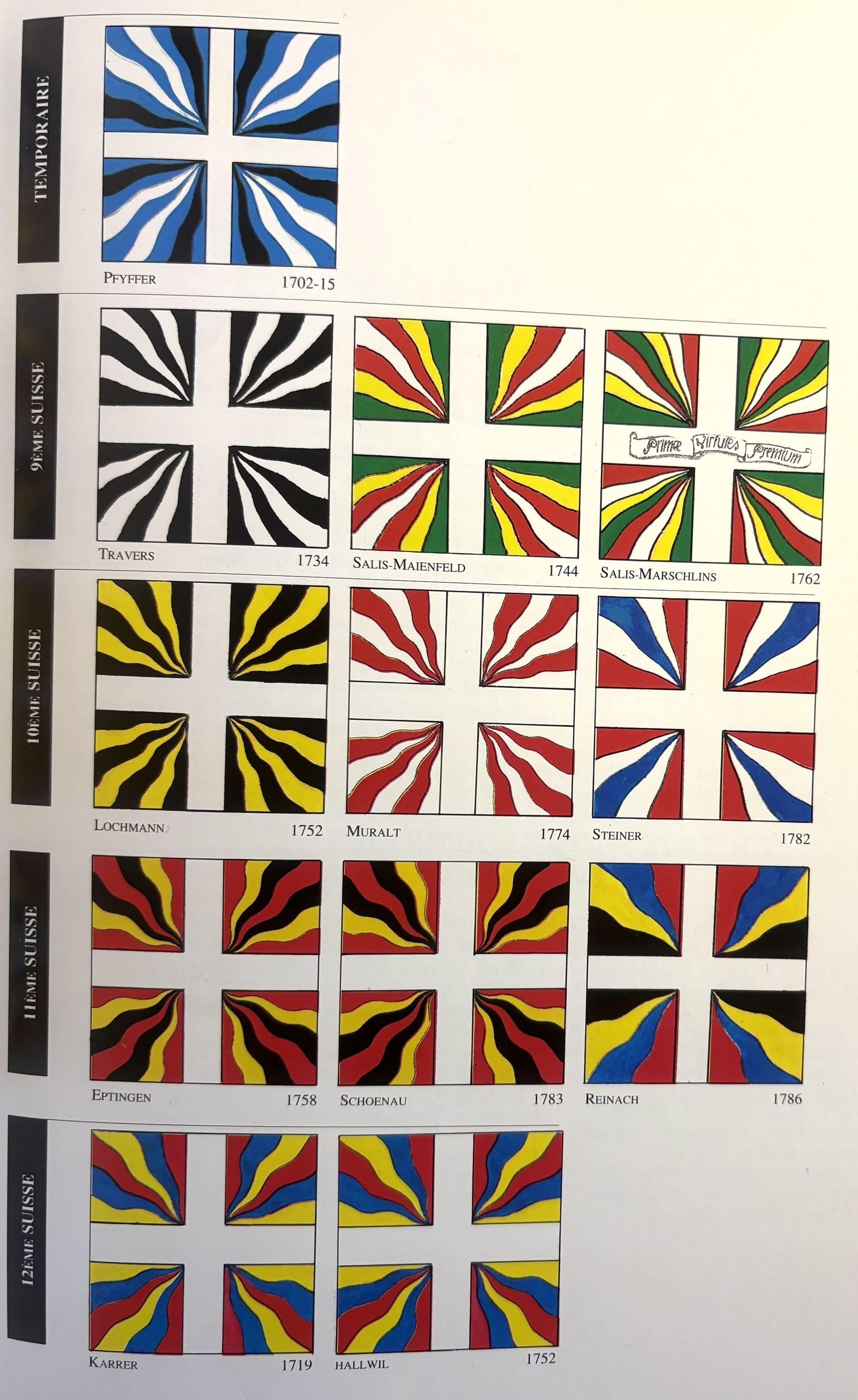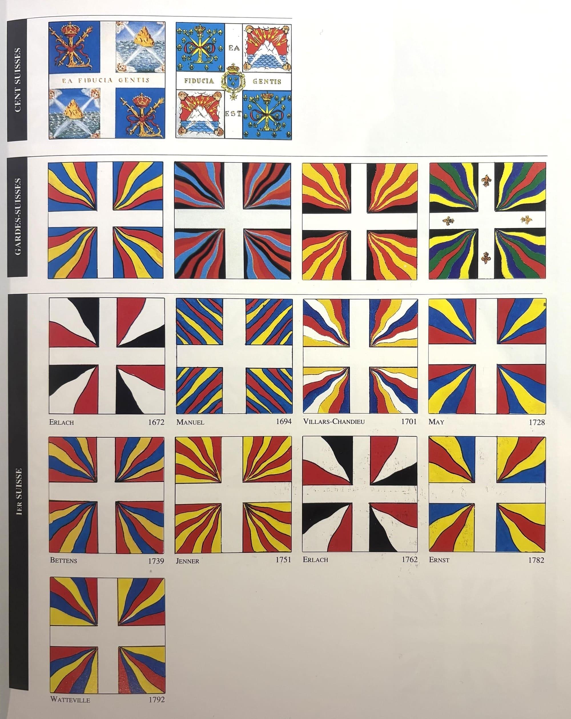 The Regiment de Gardes Suisses had six flags. I think they were identical, but they probably evolved over time. Attached is a GIF of one representation I have seen. It has the typical white Swiss cross "traversante" and thirteen "piles wavy" in each quarter. I have seen another version with only nine stripes per quarter, and a small fleur de lys at the end of each arm of the cross. A white cravat tied to the pike signified that the regiment was in the service of France.