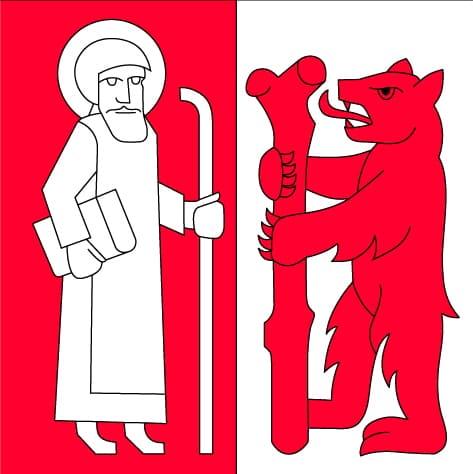 Per pale Gules St Gallus nimbed holding a Book in dexter and a walking Staff in sinister all Argent and
