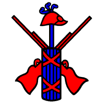 Argent two rifles gules in saltire and overall a bunch of fasces azure