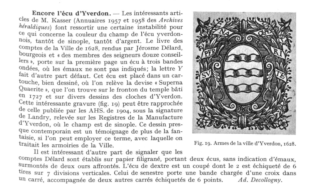 [Flag of Yverdon (1741, 190x190 cm). White cross traversante and red-black flamed quarters. In the center a cartouche with Yverdon's shield: Three white wavy bars on green (b/w photo, source: [b7b42]).