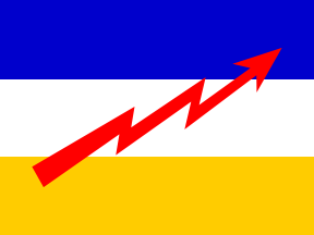 National Order Front (Frente Orden Nacional; FON) was founded in 2004 by transformation of the National Socialist Movement of Chilean Workers, and dissolved in 2012. From its predecessor, it inherited the thunderbolt symbol, but repainted it into white and placed over a red-blue horizontal bicolor, thus displaying the national colors of Chile in its flag. According to the organization's website (no longer online), rather dark shade of blue was used, but in reality it varied from rather light shade to very dark one, nearly black. The flagstaff has had a gilt finial, in shape of thunderbolt within a cogwheel.