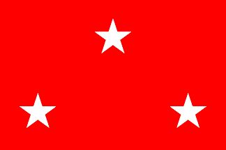 Blue flag with three white five-pointed stars, one in the midle of the top half and one in each lower corner.