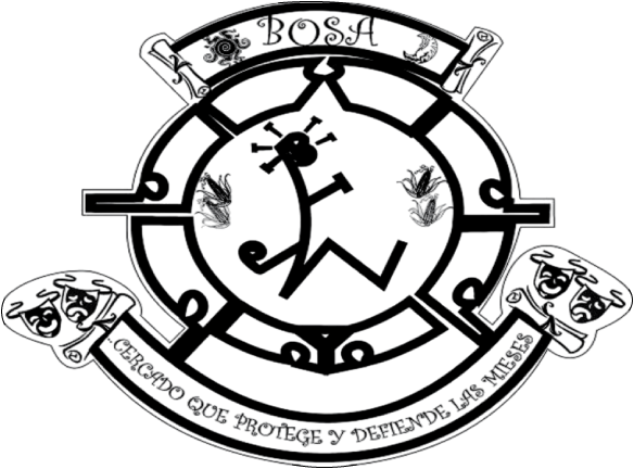 The logo as officially adopted through Local Agreement No. 001 of 22 June 2008 is in black and white, outlined in black. The top part has a ribbon which reads BOSA, and depicts to the sides of the word the sun and moon for the main Muisca deities; the ribbon has a scroll to each side recalling the Muisca legends. Underneath, a ribbon reads the meaning of its name, which is CERCADO QUE PROTEGE Y DEFIENDE LAS MIESES [Enclosure That Protects and Defends The Harvest]. To the sides of the ribbon are comedy and tragedy masks for culture. In the center, a turtle shell shape (enclosure) forms the outer ring; in its center, a man as depicted by the Muisca Indians protects two cobs of corn on each side, and overall represents the local name.