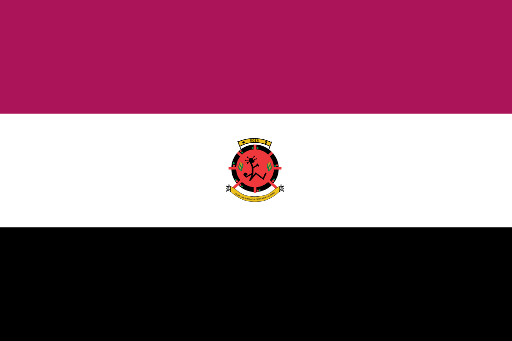 The flag is a horizontal triband of purplish-red, white, and black. It has, in its center, a small version of the local emblem over white. It was adopted officially through Local Agreement No. 001 on 22 June 2008, though the image made official in the document is distorted and has a red stripe instead of the purplish-red actually found.