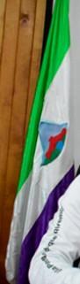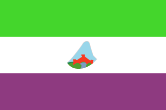The flag was adopted officially through Local Agreement No. 019 of 28 February 2023, in effect on 13 March 2023. The flag of Puente Aranda is a horizontal tricolor of green-white-purple. In its center is a map of the locality, over which the historic Puente de Aranda is seen among green shrubs crossing over the Chinua River. Green is for nature; white is for peace; and purple for gender equality. The bridge is in red for bravery and power, while its background is blue for justice. It was adopted after the council held a public vote after having multiple designs, the public voting ending on 18 February.