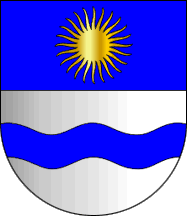 The arms had a shield party fesswise the I Azure a sun Or and the II Argent a bar wavy Azure.