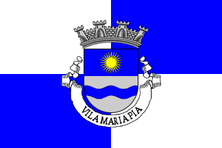 The colonial-era flag of this municipality was interestingly quite similar to the current one, with a quartered background of blue over white and an emblem showing also the sun shining over waves. Mural crown Argent with four visible towers (town rank) and white scroll reading in black upper case serifed letters "Vila Maria Pia". The banner should have silvery and blue tassels and cord, and golden staff with a spear finial. Flag and arms approved by the Overseas Ministry in Ministerial Diploma (Diploma Legislativo Ministerial) n.º 4 and published in the official journal (of the colony) Boletim Oficial de Cabo Verde : I Série : 12.º Suplemento of 1955.05.22.