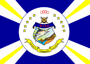 The municipal flag Tarrafal de São Nicolau mun. does not follow the pattern of other, previously reported caboverdean municipal flags. It does have a central logo, which does match the loose scheme of others known so far, but it is set on a background that is neither monocolored nor quartered of two colors.