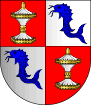 The arms have on a quartered shield the I and II Gules a salt cellar Argent garnisged Or and in the II and II Argent a fish hauriant bendwise Azure.