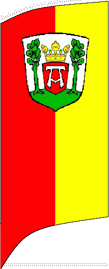 The banner is divided vertically into red and yellow with the city’s coat of arms shifted to the top.