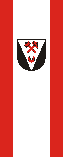 It is a red-white-red vertical triband with ratio of stripes 1:3:1. The arms are shifted to the top.