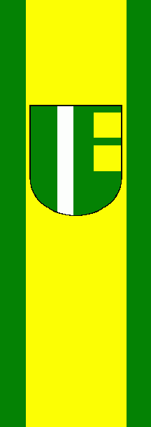 It is a green - yellow - green vertical triband with ratio 1:4:1. The coat of arms is in the central stripe and shifted to the top.