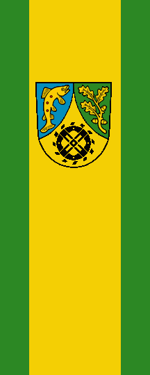 It is a green-yellow-green vertical triband with ratio of stripes 1:3:1. The coat of arms is in the middle of the white stripe.