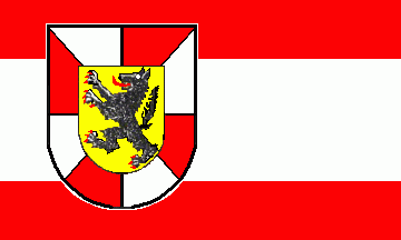 Shield gyronny of eight of Gules and Argent, inescutcheon Or charged with a wolf rampant Sable armed and tongued Gules. The shield on flag has a thin white fimbriation.
