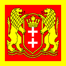 Neubecker 1992 [neu92] contains a plate with the flags of Danzig, and here we find a flag for the Senate members at sea: a square, red flag bordered in yellow all around; on the red field, two lions standing on two narrow wavy lines and holding a shield with the crosses and crown.