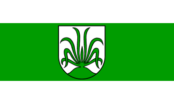 It is a white-green-white horizontal triband with ratio of stripes approx. 3:7:3. The coat of arms is slightly shifted to the hoist.