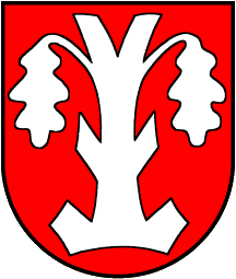 Shield Gules, a stylised oak stem Argent with two leaves.