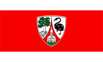 The shield is divided per chevron ployé into silver (= white) over red. Below is a silver (= white) church standing on a green base. Above right is green, rooted oak. Above left is a black swan armed red.