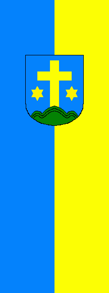 It is a light blue - yellow vertical bicolour. The coat of arms is shifted to the top.