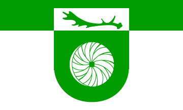It is a green over white horizontal bicolour with ratio approx. 5:14. The coat of arms is in the centre that way that the chief is continued by the line of separation of both stripes. All elements of the coat of arms are green.