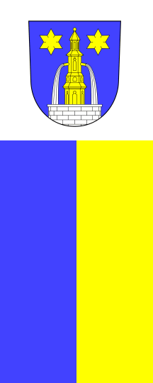 It is a blue-yellow vertical bicolour with arms in a white bannerhead.