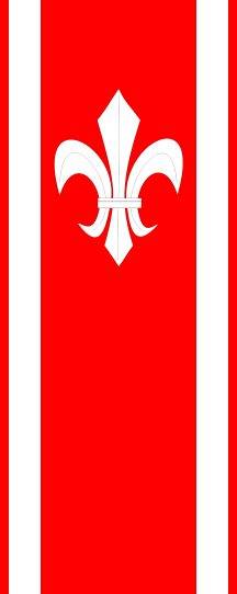 It is a vertical 5-stripes banner with alternating red and white stripes with ratio approx. 1:4:20:4:1. The coat of arms without shield is shifted to the top within the central stripe.