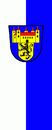 It is a white-blue vertical bicolour. The coat of arms is shifted to the top.