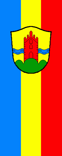 It is a red-yellow-blue vertical tricolour. The coat of arms is shifted to the top.