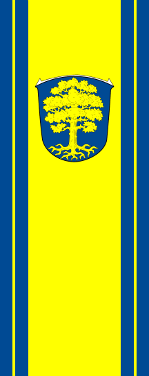 The banner is yellow with blue vertical edges, each one superimposed by a thin vertical yellow line. The coat of arms is shifted to the top within the yellow stripe.