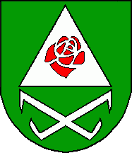 Shield Vert, an equilateral triangle Argent, charged with a rose Gules, in base two double hooks Argent in saltire.