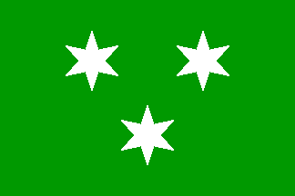 On a green field, three white six-pointed stars, arranged 2,1. Probably
