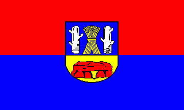 It is a red over blue horizontal bicolour with centred arms.