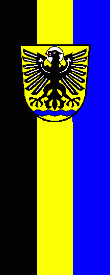 It is a black-yellow-blue vertical tricolour. The coat of arms is shifted to the top.