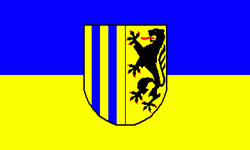 It is a horizontal blue over yellow bicolour. The plain bicolour is the official city flag according to source, probably to avoid confusion with the flag of Leipzig, but Gunnar Staack reported that nevertheless a flag with arms is predominantly was in use within the city.